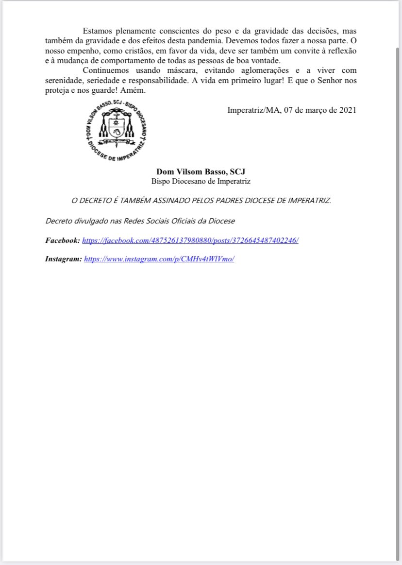 Dom Vilson Basso, bispo de Imperatriz (MA), suspendeu missas, celebrações e reuniões por 15 dias, de 8 a 22 de março, nas 32 paróquias da diocese, para salvar vidas, proteger a saúde das pessoas e enfrentar o coronavírus.