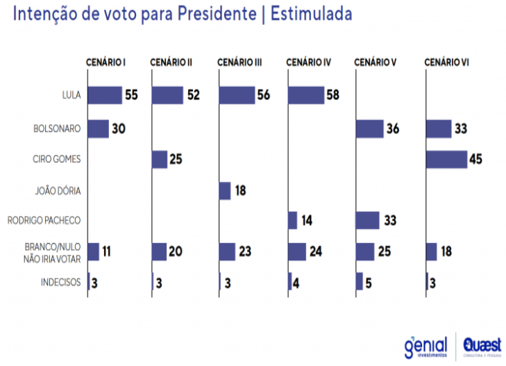 Com 47% das intenções de votos, o ex-presidente Lula (PT), aumentou as chances do petista vencer as eleições no 1º turno em 2022, é que revela a Pesquisa Genial/Quest divulgada nesta quarta-feira, dia 1º.