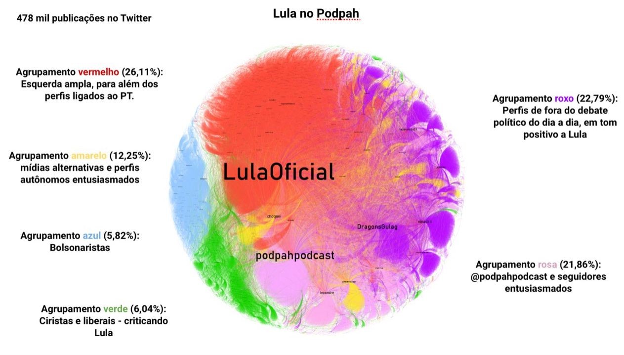 Segundo a análise da Arquimedes, o alcance do debate para além dos perfis alinhados a Lula aconteceu também por se tratar de um podcast cujo público não consome política cotidianamente. Bruzzi explica que o ex-presidente “amplificou bastante os públicos que dialogaram entre si”.