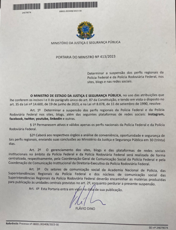 O ministro da Justiça e Segurança Pública, Flávio Dino, nesta quinta-feira, dia 29, determinou a suspensão dos perfis regionais da Policia Federal e Polícia Rodoviária Federal.