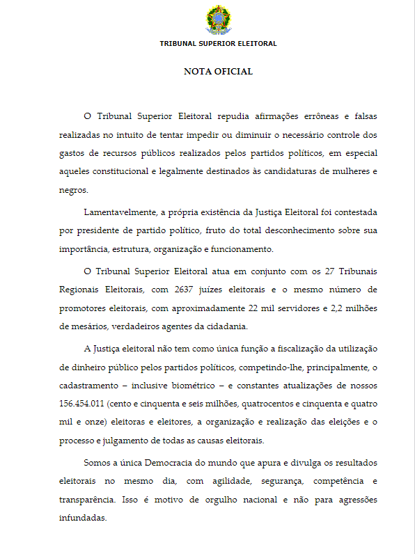 “…O Tribunal Superior Eleitoral repudia afirmações errôneas e falsas realizadas no intuito de tentar impedir ou diminuir o necessário controle dos gastos de recursos públicos realizados pelos partidos políticos, em especial aqueles constitucional e legalmente destinados às candidaturas de mulheres e negros. Lamentavelmente, a própria existência da Justiça Eleitoral foi contestada por presidente de partido político, fruto do total desconhecimento sobre sua importância, estrutura, organização e funcionamento…”, diz trecho da nota.
