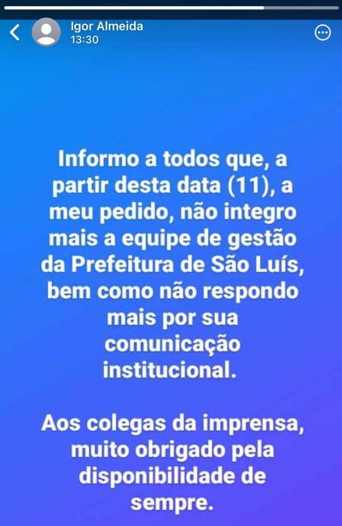 O jornalista, Igor Almeida, anunciou no início da tarde desta segunda-feira, dia 11, sua saída do comando da Secretaria Municipal de Comunicação, da gestão Eduardo Braide (PSD), em São Luís.