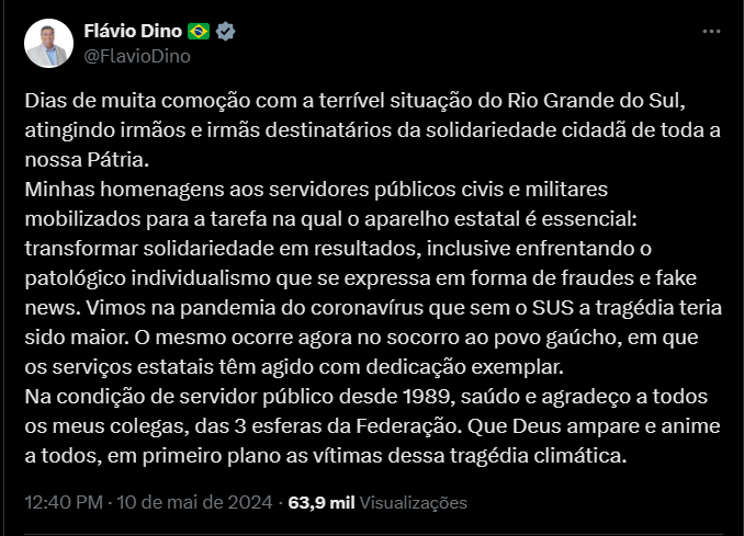 Devido a ‘enxurrada de fake news’ relacionadas a tragédia no Rio Grande do Sul, o ministro Flávio Dino do STF, não resistiu e voltou ‘condenar’ a disseminação criminosa de mentiras em grande escala no país.