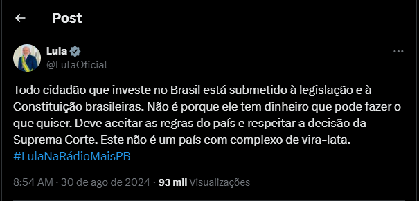 O presidente Lula (PT), entrou nesta sexta-feira, dia 30, na polêmica envolvendo o ministro do STF, Alexandre de Moraes, e o dono do X, Elon Musk. Para Lula, “todo cidadão que investe no Brasil está submetido à legislação e à Constituição brasileiras. Não é porque ele tem dinheiro que pode fazer o que quiser”.