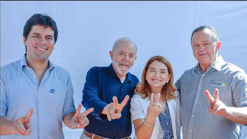 Na imagem, o presidente Lula (PT), o governador Carlos Brandão (PSB), a deputada Iracema Vale (PSB) e o ministro André Fufuca (PP), estão fazendo o gesto da vitória “V”.