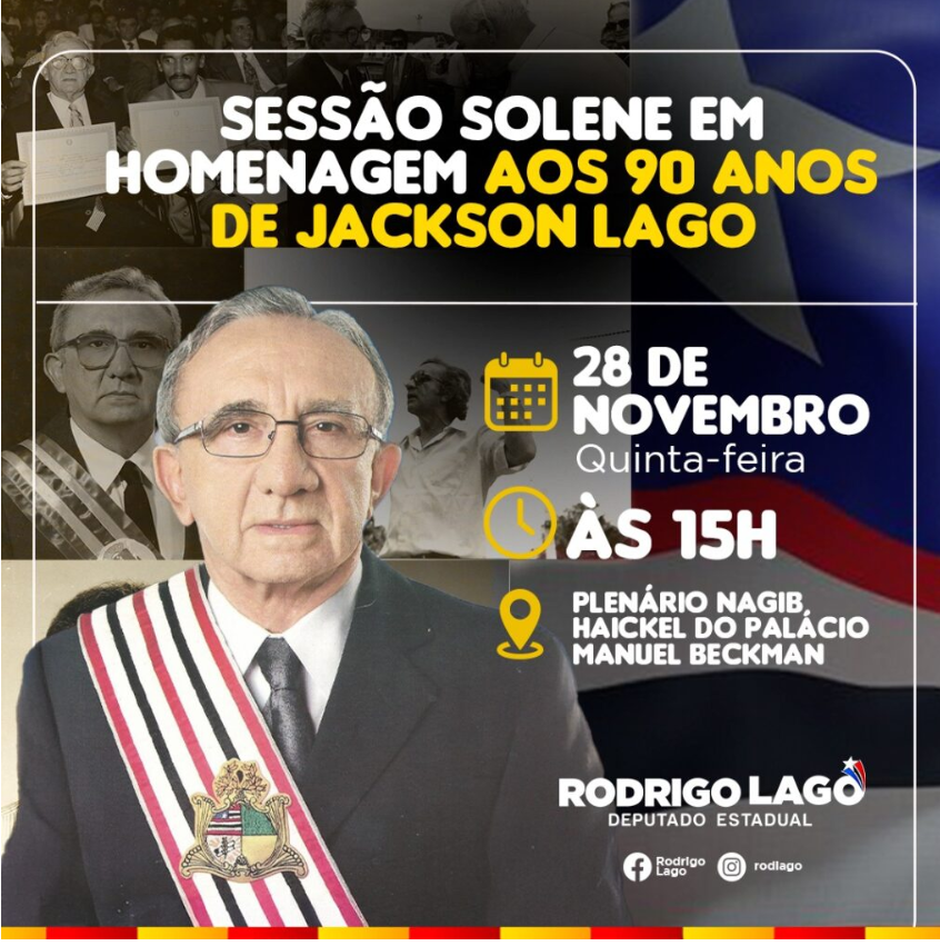 A Assembleia Legislativa do Estado do Maranhão realizará, na quinta-feira, dia 28 de novembro, às 15h, no Plenário Nagib Haickel, a sessão solene em homenagem aos 90 anos de nascimento de Jackson Lago, ex-governador e um dos maiores líderes populares da história do estado.