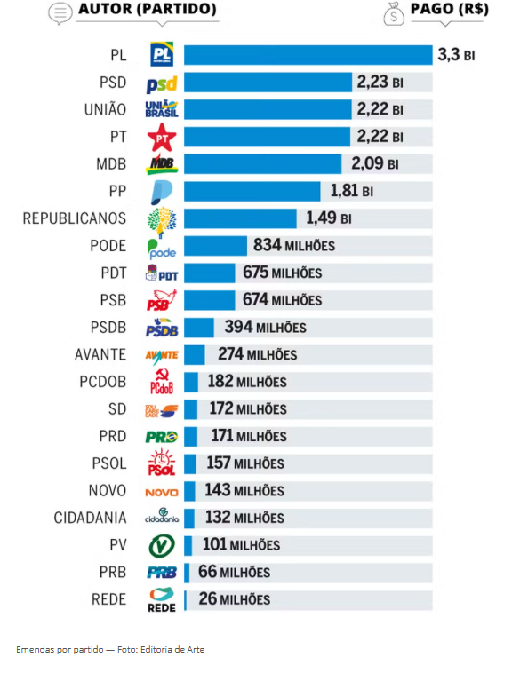 O ranking, por partidos, para liberação das emendas trás PL, PSD, UNIÂO e PT, como s siglas que receberão os maiores valores.