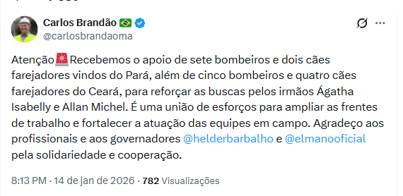 Além de agradecer à cooperação dos governadores Helder Barbalho, do Pará, e Elmano de Freitas, do Ceará, Brandão disse que essa iniciativa vai fortalecer o trabalho das equipes na busca pelas duas crianças.