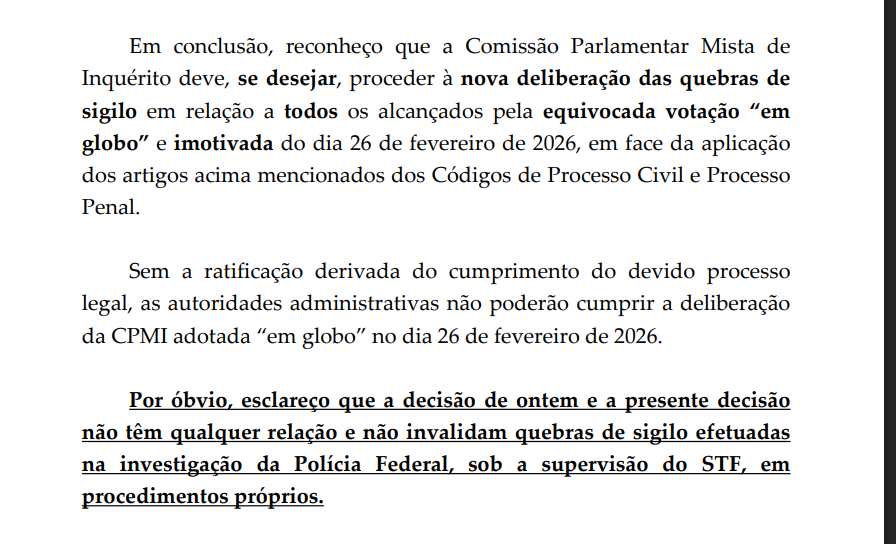 Ele disse ainda que embora CPIs tenham poderes para determinar quebras de sigilo, essas decisões devem seguir parâmetros semelhantes aos exigidos do Poder Judiciário.