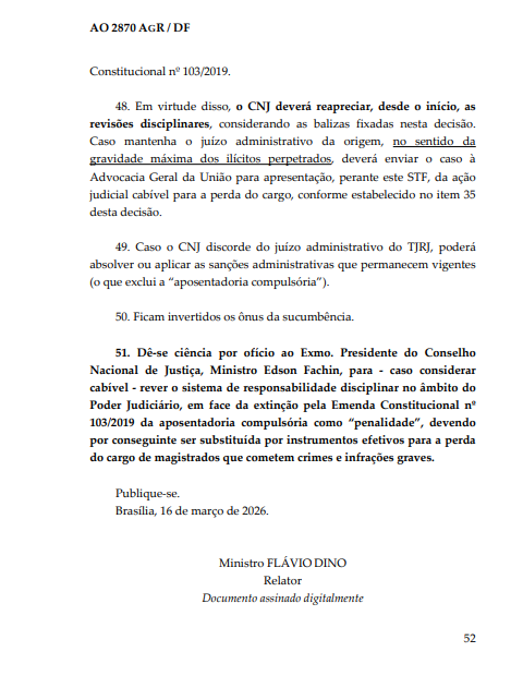 Na decisão, o relator determinou ainda que o CNJ reanalisasse o processo disciplinar e, se entender que há comprovação de que o juiz cometeu infrações graves, envie o caso à Advocacia-Geral da União (AGU) para apresentação da ação judicial cabível perante o Supremo para a perda do cargo.