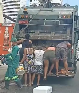 Flávio Bolsonaro utilizou imagens de 2021, durante o governo do seu pai, que viralizaram à época. No vídeo, várias pessoas disputam alimentos dentro de um caminhão de lixo parado em frente a um supermercado, em Fortaleza, capital do estado do Ceará.