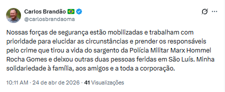 O governador Carlos Brandão se solidarizou e informou na manhã desta sexta-feira, dia 24, que as forças de segurança do Maranhão estão empenhadas para esclarecer e prender os autores da morte do policial militar Marx Hommel Rocha Gomes, ocorrido na noite de ontem, no bairro do São Raimundo, em São Luís.