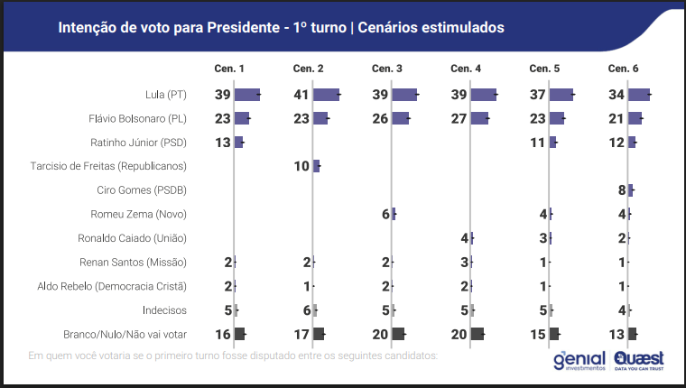 O levantamento mostra: Lula marca entre 34% e 41% de intenções de votos; Flávio tem entre 21% e 27%; Tarcísio de Freitas (Republicanos), Ratinho Junior (PSD), Romeu Zema (Novo), Ronaldo Caiado (União), tiveram, no máximo, 10%, 13%, 6% e 4% das intenções de votos.