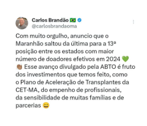 O Maranhão saiu da 27ª colocação para 13ª posição no ranking nacional de doação de órgãos entre os estados. O governador Carlos Brandão comemorou nas redes sociais nesta terça-feira, dia 27, o avanço.