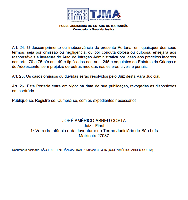 O documento também estabelece outras medidas referentes ao procedimento de requerimento de alvarás judiciais para os festejos de São João de 2024.