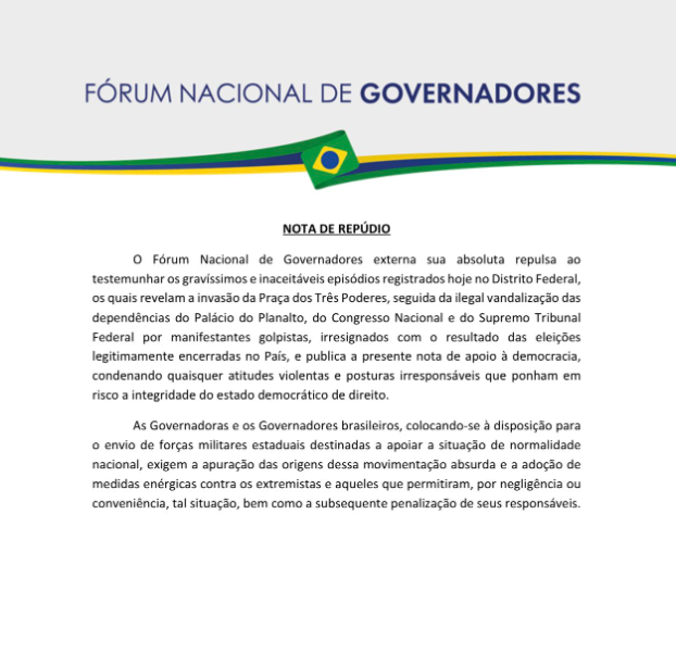 O Fórum de Nacional de Governadores em nota repudiaram os atos terroristas em Brasília, e ainda, oferecem forças militares estaduais para enfrentar os atos golpistas.