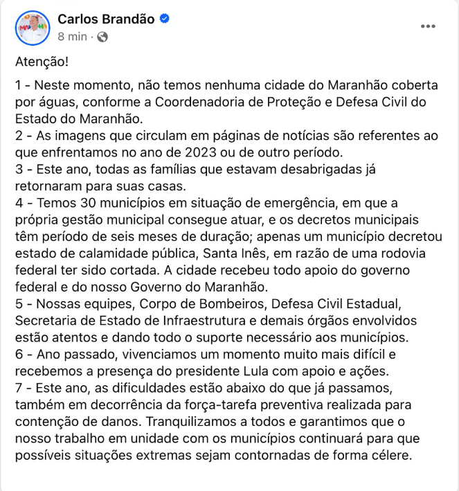 O governador do Maranhão, Carlos Brandão (PSB), comunicou através das redes sociais que ao contrário do que informou a Coordenadoria de Proteção e Defesa Civil do Maranhão, não há cidade no estado coberta por águas e que as cidades atingidas pelas chuvas têm recebido o suporte necessário.