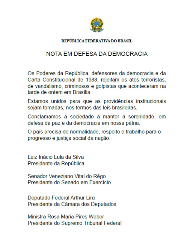 “Com os presidentes dos Poderes da República no Palácio do Planalto, Rosa Weber, presidente do STF, Vital do Rêgo, presidente em exercício do Senado, e Arthur Lira, presidente da Câmara dos Deputados. Firmes na defesa da democracia. Manifestação conjunta dos presidentes dos Poderes da República, assinada na manhã de hoje, em repúdio aos atos golpistas de ontem em Brasília.”, divulgou Lula.