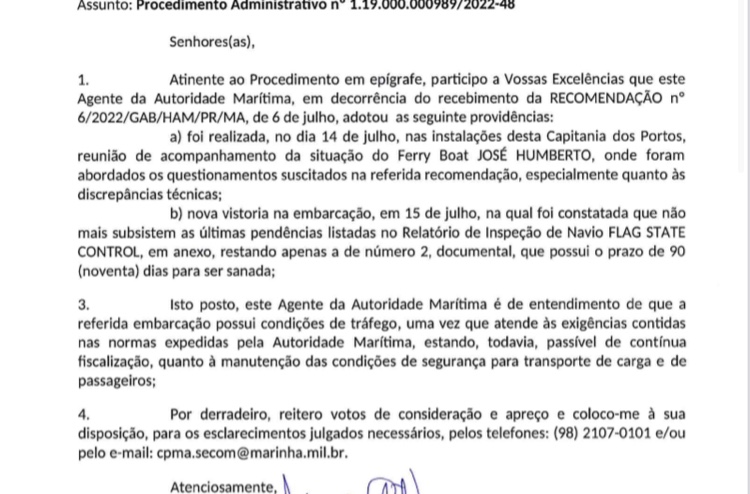 O ferryboat saiu do Terminal da Ponta da Espera, em São Luís, e tinha previsão de chegar por volta das 5h de hoje no Cujupe, em Alcântara. As causas do problema na embarcação estão sendo apuradas.