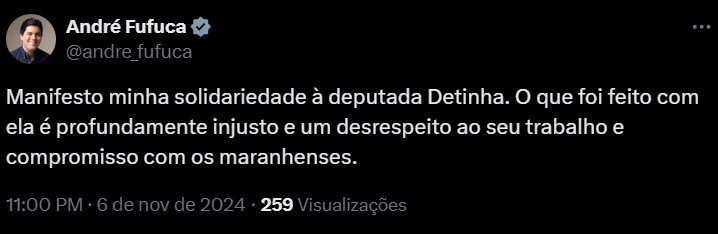 Sobre o imbróglio relacionado ao PL Mulher no Maranhão, o ministro dos Esportes, André Fufuca, e também, a senadora Eliziane Gama (PSD), se solidarizaram com a deputada federal Detinha.