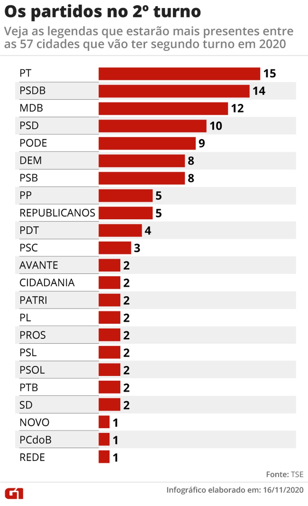 Nas 57 cidades que haverá 2º turno, o PT disputará em 15. Na sequencia vem PSDB com 14 e MDB com 12. Nas capitais o MDB disputará em 7 das 18.