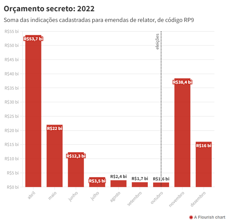 Após o segundo turno das eleições, realizado no dia 30/10 do ano passado, houve uma explosão de pedidos. Em novembro, as solicitações dispararam e chegaram a R$ 38 bilhões. No mês seguinte, no apagar das luzes das emendas de relator, foram R$ 16 bilhões.
