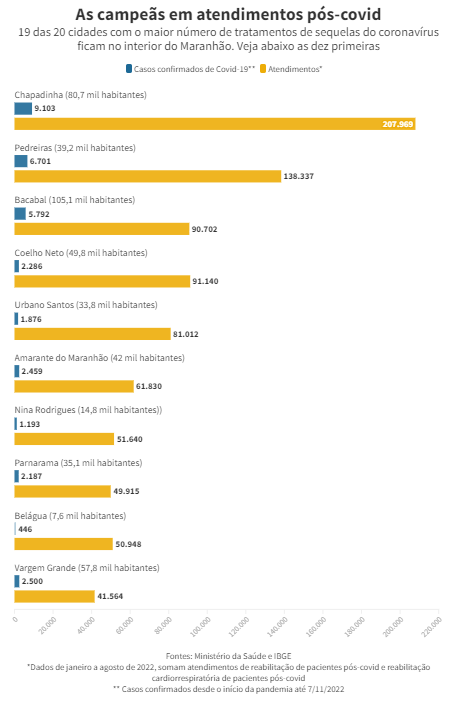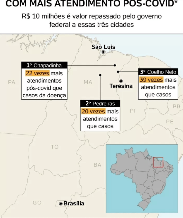 É uma disparidade gigantesca se comparada com os tratamentos do restante do Brasil. O escândalo faz com que Pedreiras e outras 18 cidades do interior do Maranhão, uma região que registrou apenas 0,14% dos 34 milhões de casos de covid da pandemia, totalizem 1,1 milhão de atendimentos pós-covid no ano, enquanto todo o resto do Brasil notificou 200 mil terapias.