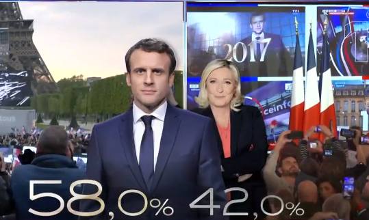 Os franceses reelegeram neste domingo, dia 24, Macron com 58% dos votos, a candidata da extrema direita Le Pen foi votada por 42% dos eleitores.