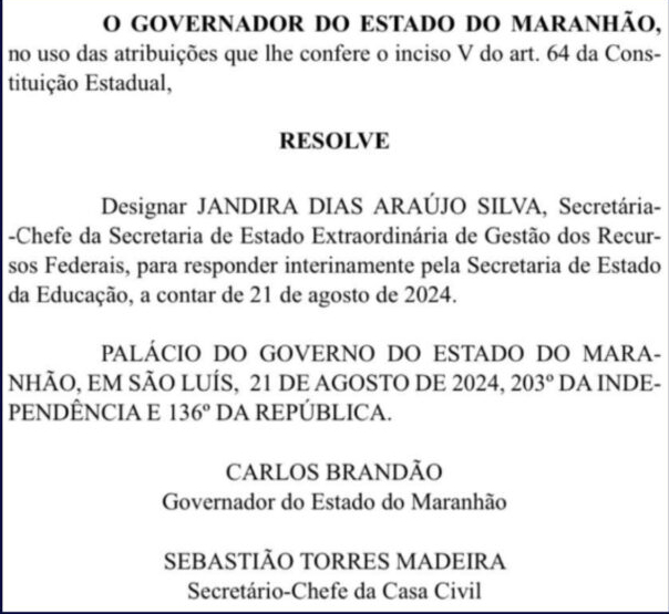 O governador Carlos Brandão nomeou semana passada Jandira Dias como nova secretária da pasta. Ela ocupava a secretária Extraordinária de Gestão dos Recursos Federais.