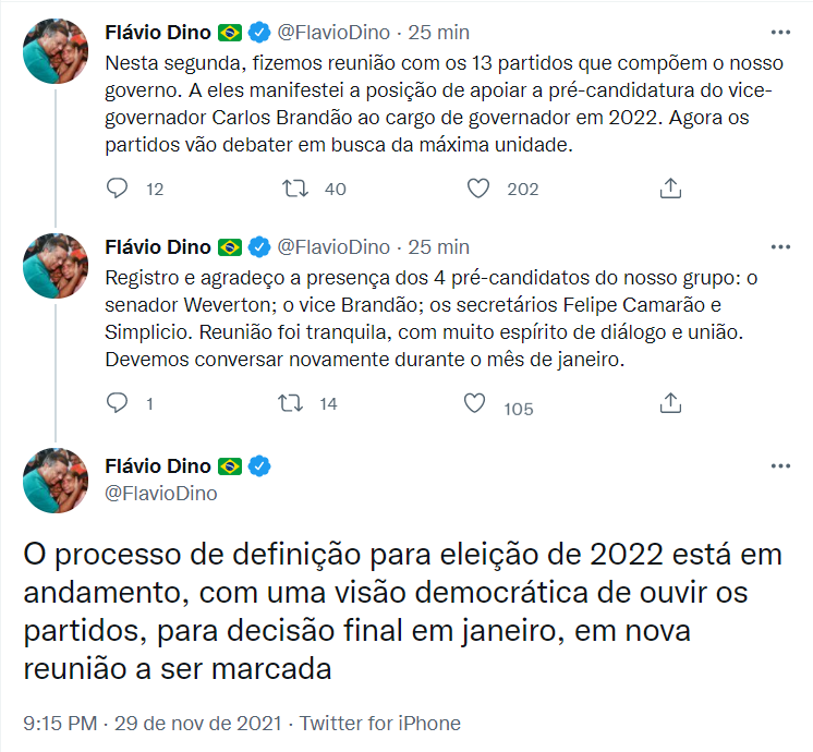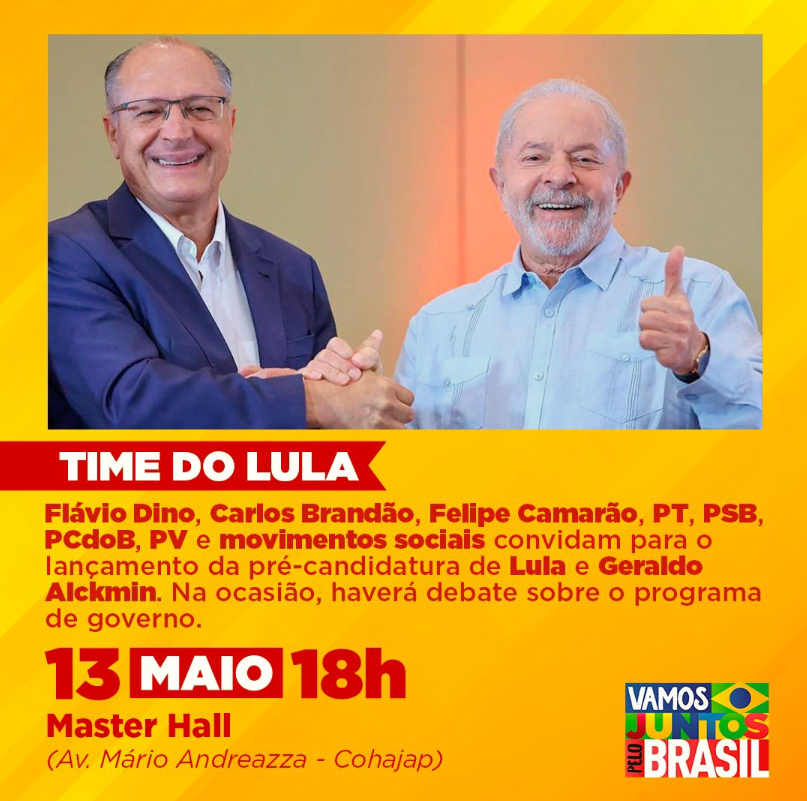“Dia 13, em São Luís, vamos reunir apoiadores do Time de Lula no Maranhão, que estão com @carlosbrandaoma e @FelipeCCamarao. Vamos tratar da organização da pré-campanha e dos debates sobre programa de governo. Evento aberto a todos que queiram participar”, destacou Dino nas redes sociais.