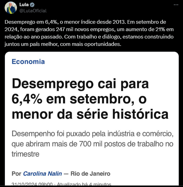 Também recorde, a população no Brasil com algum tipo de rendimento em 2024 chegou a 143,4 milhões. Já a população que recebe benefícios provenientes de programas sociais do governo cresceu de 18,6 milhões em 2023 para 20,1 milhões em 2024.