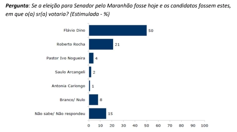 A pesquisa também mediu as intenções de votos para o Senado Federal. O ex-governador Flávio Dino (PSB), lidera a disputa com 50%. O senador Roberto Rocha (PTB), permanece na segunda posição, com 21%.