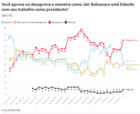 Pesquisa Exame/Ideia após a crise na saúde em Manaus e a forma como o governo agiu em relação a vacinação contra a Covid-19, e divulgado nesta sexta-feira, dia 22, mostra que a aprovação do presidente Jair Bolsonaro caiu de 37% para 26%, a maior queda semanal desde o início de seu governo.