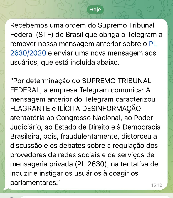 “Nos termos requeridos pela Procuradoria-Geral da República, determino a instauração de inquérito em face dos diretores e demais responsáveis da Google Brasil e do Telegram Brasil, que que tenham participado da campanha abusiva contra o Projeto de Lei 2.630/2020 (…) a conduta das plataformas pode “configurar, em tese, não só abuso de poder econômico às vésperas da votação do projeto de lei por tentar impactar de maneira ILEGAL e IMORAL a opinião pública e o voto dos parlamentares, mas também flagrante induzimento e instigação à manutenção de diversas condutas criminosas praticadas pelas milícias digitais investigadas no Inquérito 4.874”.