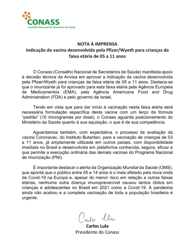 A vacina será aplicada em doses, sendo a segunda dose após três meses da primeira dose e conforme orientação do Ministério da Saúde, a imunização vai começar pelas crianças de 10 e 11 anos e avançará a faixa etária progressivamente, assim que novos lotes forem entregues pelo laboratório fabricante e distribuídos aos estados.